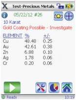 GoldXpert的這個(gè)獨(dú)特功能在篩檢金樣件時(shí)可以探測(cè)出可能是鍍金或涂金的樣件。GoldXpert在發(fā)現(xiàn)鍍金或涂金樣件的同時(shí)還會(huì)提供樣件的化學(xué)成份信息。這個(gè)功能在GoldXpert確定樣件可能為涂金或鍍金樣件時(shí),會(huì)提醒用戶注意。