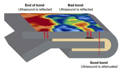 探頭的零度超聲聲束和內(nèi)置編碼器有助于生成清晰的C掃描圖像。在粘結(jié)合格的區(qū)域,所發(fā)送的聲束能量會(huì)在穿過(guò)粘膠層和金屬板時(shí)發(fā)生衰減。如果粘結(jié)效果不好,則聲束會(huì)反射回來(lái)。在