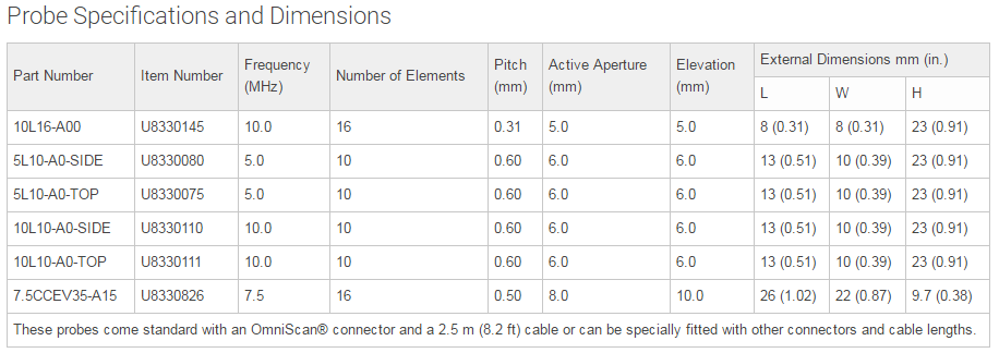 Small-footprint probes offer access to confined areas (A00 probe has an 8 × 8 mm footprint) A special-design small-footprint wedge is available for those applications. Cable connector can come out from either the side or the top of these probes.